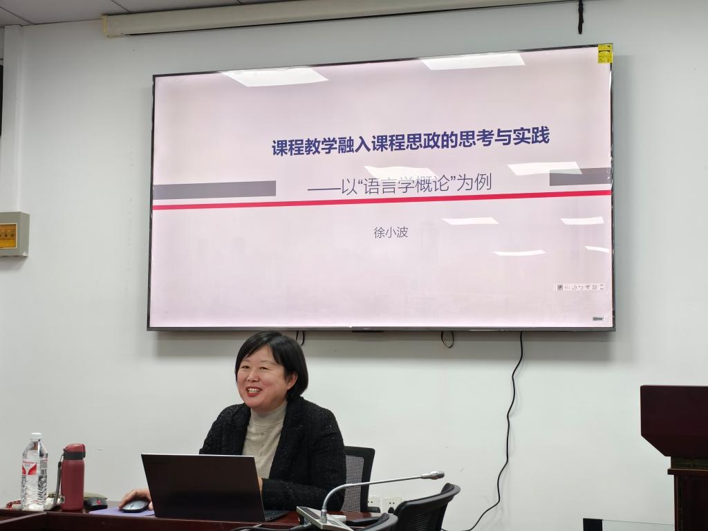 围绕“课程教学融入课程思政的思考与实践”这一主题,徐小波分享了在建设课程思政方面的经验、心得,从解读政策文件、把握课程特点、拓展实施路径、融入教学理论、坚持素材积累、注意与时俱进等方面详细介绍了课程思政建设的过程。徐小波分以《语言学概论》这门课程为例,向大家展示和分析了如何将课程思政的理念潜移默化地融入到专业教学、课堂教学、课程实践等环节中。徐小波列举了课程思政实施过程中的注意事项和误区,提醒大家进行课程思政要杜绝“表面化”、“硬融入”,防止“贴标签”、“两张皮”,做到润物无声,春风化雨。